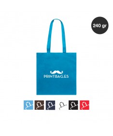 Bolsas impresas con tu logo, ecológicas y fabricadas en algodón 100% de 240 g/m². Con terminación cosida y asas largas reforzadas (70 x 2,5 cm). Disponible en variada gama de colores. Resistencia hasta 10 kg de peso.