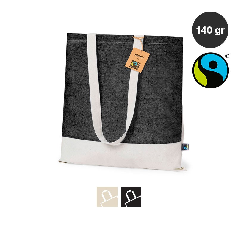 Bolsas para la compra ecológicas, hechas en algodón 100% de 140 g/m². Con certificación Fairtrade (Comercio Justo), un sistema comercial solidario y alternativo al convencional que persigue el desarrollo de los pueblos y la lucha contra la pobreza. Con terminación cosida y asas largas reforzadas con base en tono natural y parte frontal superior disponible en tonos negro y natural. Incluida etiqueta Fairtrade y hangtag distintivo en cartón...