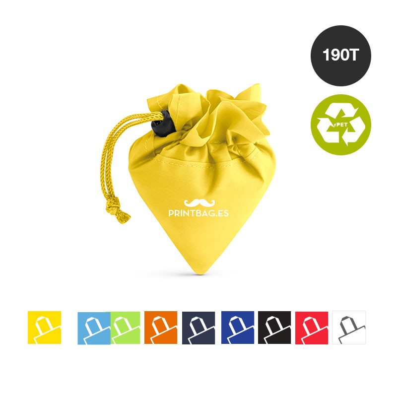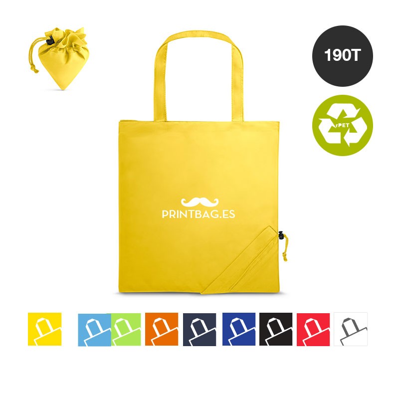 Bolsas plegables publicitarias para la compra, fabricadas en poliéster de 190T con goma elástica para cerrar, impresas con tu logo o marcar para dar en comercios, en colores Amarillo, Azul, Blanco, Fucsia, Naranja, Negro, Rojo, Verde y tamaño 38 x 41 cm sin fuelle.