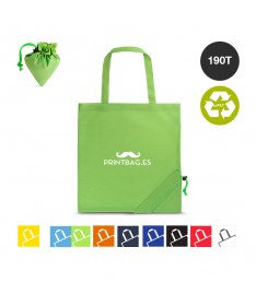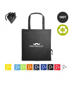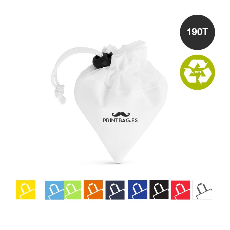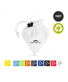 Bolsas plegable de línea nature fabricada en 190T RPET. Con terminación cosida y con asas largas reforzadas (70 x 2,5cm). Plegado de pequeño tamaño mediante cordón con accesorio de ajuste. Disponible en variada gama de colores, con distintivo RPET en etiqueta exterior. Resistencia hasta 8 kg de peso.